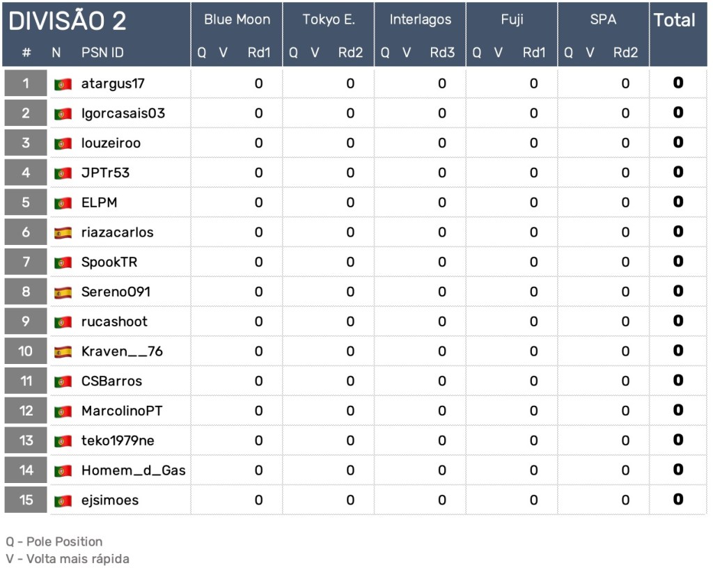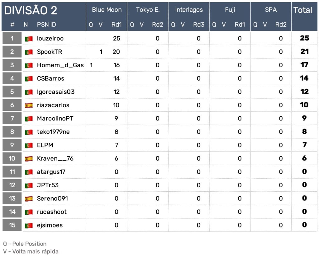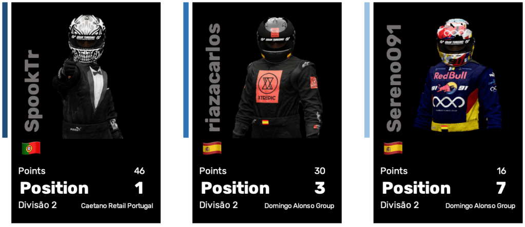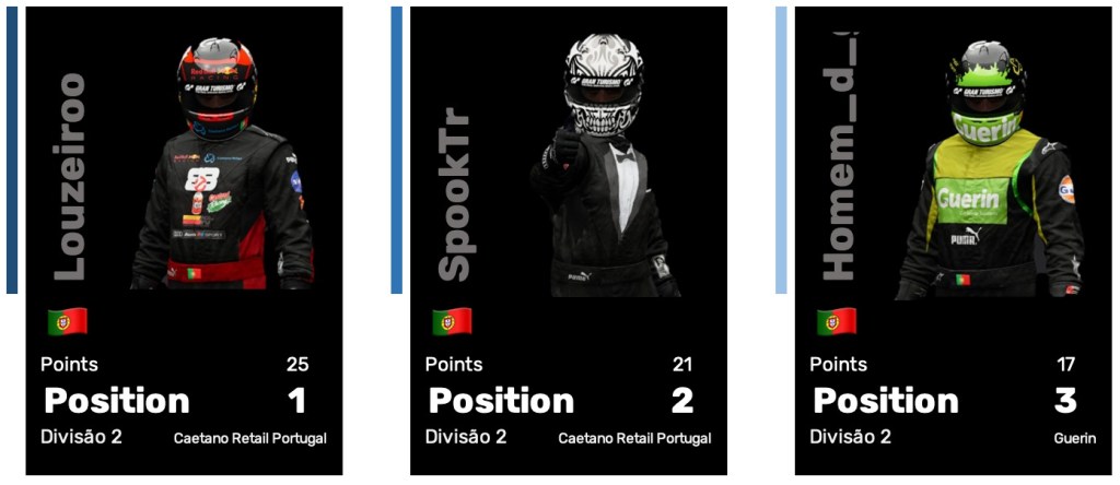Terminada esta ronda final da Divisão 2 é tempo de classificação geral final. Especial destaque para o pódio: 1º lugar para o Sérgio Barros, bicampeão da Divisão 2; 2º lugar para o António Medina (Medina2610); e 3º lugar do pódio para o Carlos Pais.
