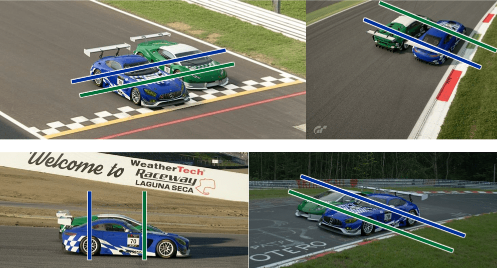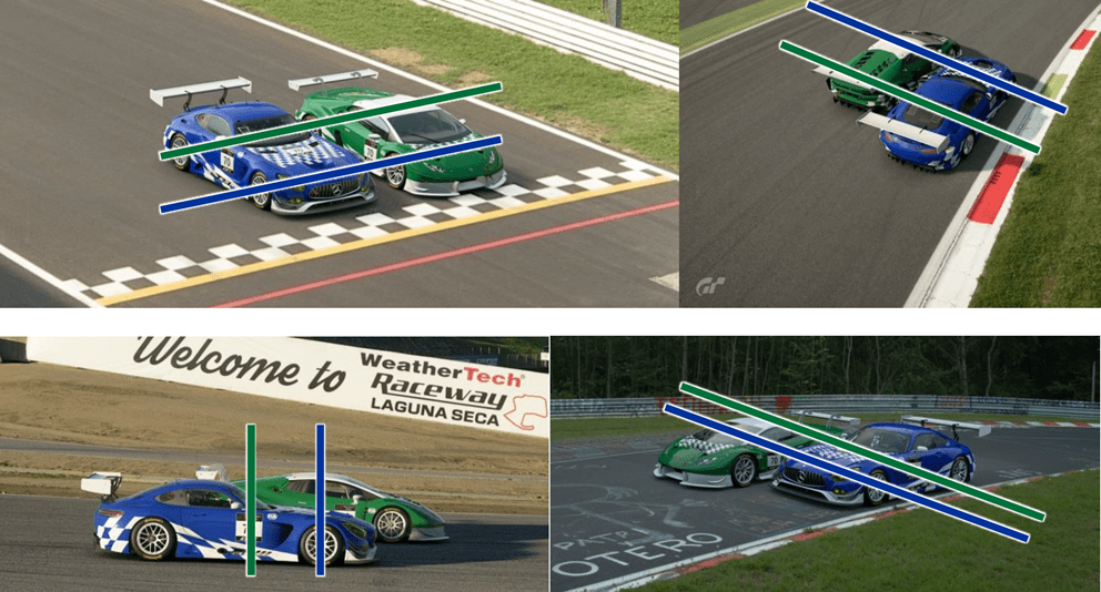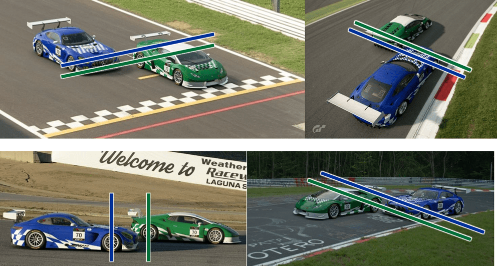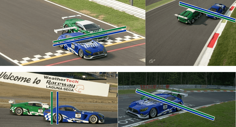 Nesta posição, o carro azul está claramente à frente do carro verde, no entanto a ultrapassagem ainda não está completa uma vez que o eixo traseiro ainda não ultrapassou o eixo dianteiro do carro verde. Mantém-se a regra da partilha da pista.