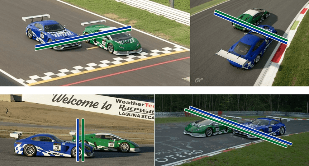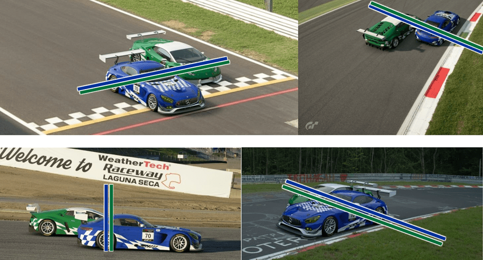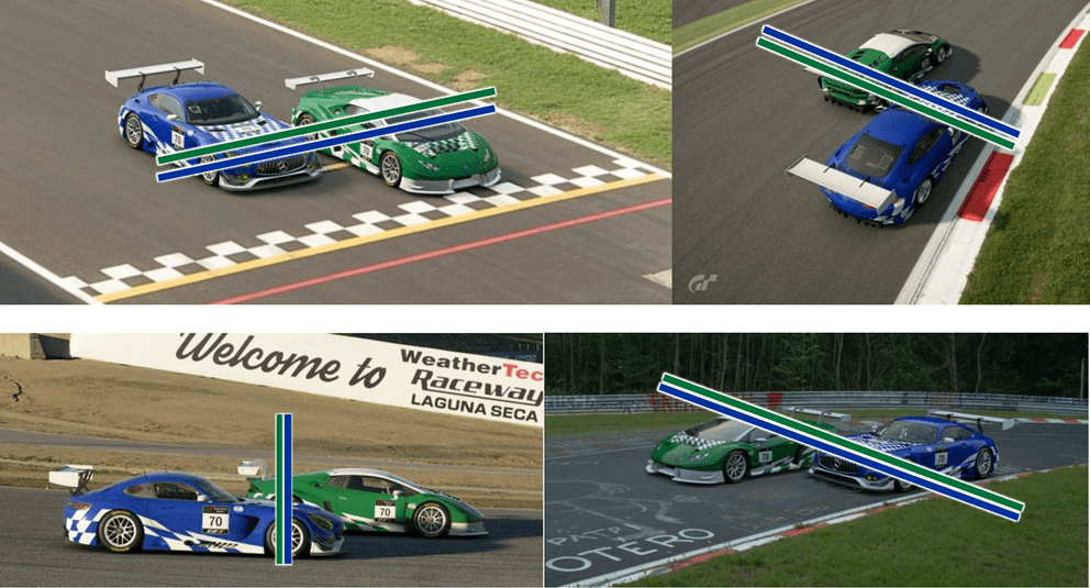 Nesta situação embora a frente do carro azul ainda esteja ligeiramente atrás do carro verde, estão claramente lado a lado, pelo que cada carro deverá fazer a curva nos 50% da pista do seu lado, sem importunar o outro carro.